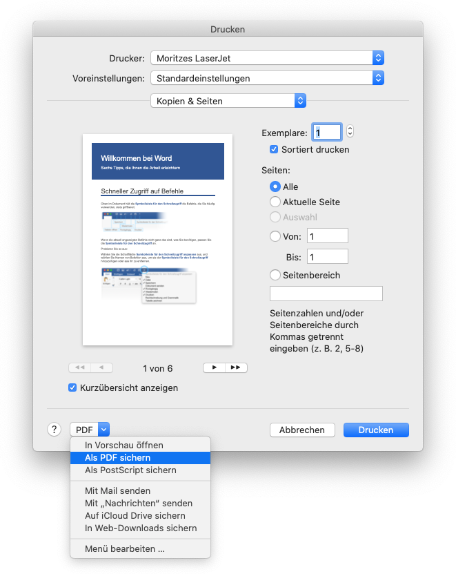 Anschliessend klickt man unten links im Drucken-Dialogfenster auf den Knopf “PDF” und wählt anschliessend “Als PDF sichern”: